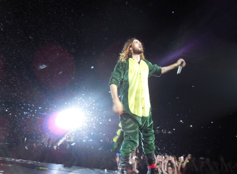 I couldn’t stop laughing when the boys returned on stage wearing onsies, mainly because I had seen these onsies at a women’s fashion store called ICE and I wondered whether they knew that. When Jared asked who wanted to come on stage with him a thousand people surged forward and I was pushed back even further. I knew I never had a chance of getting on stage ever but the desperation from some people was a little terrifying, I have to admit. Maybe it’s my introverted personality but when you have to rip someone up from the floor because they are getting trampled from the surging mosh pit it’s definitely not enjoyable. Fun tip if you are an Echelon reading this book Jared will get you on stage if you are A) Wearing something ridiculous B) A small, tiny child C) On someone’s shoulders.