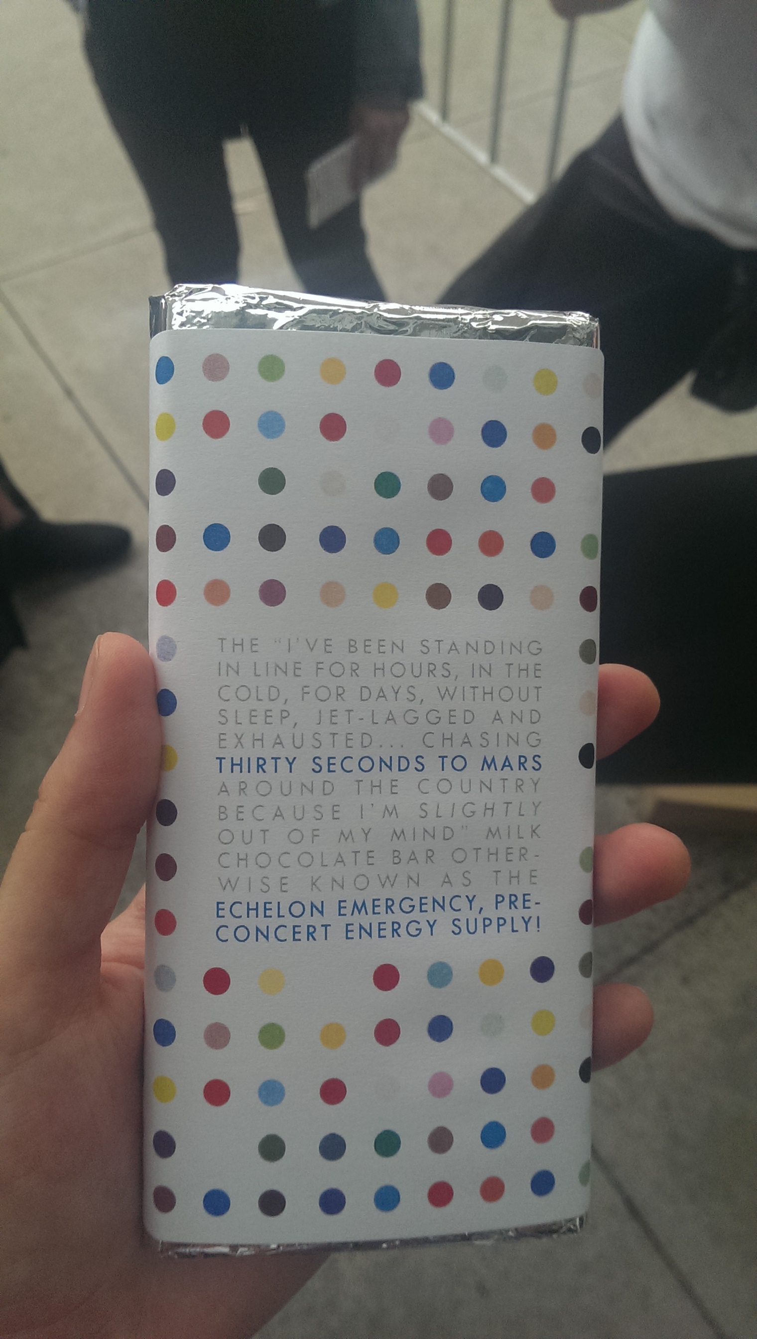 The Melbourne show was in two days and I had decided to make a poster for the event to take to the show. In my rush to the airport at 5am though I had left my poster behind and had to make a new one, which actually worked out okay in the end because it was a better quality poster and I did two sides instead of one, the serendipity of events. I had tweeted a photo of my poster and hashtagged #MARSinAustralia on the end and to my great surprise Jared Leto added it to a favourite on twitter in a matter of minutes. It had made my morning to see that. Later that day I went down to the Melbourne Hinense Stadium for Soundcheck that I had purchased. I met other Echelon there, some absolutely wonderful people who I could talk to about the band’s music with and exchange stories of how they had discovered the band. A girl named Rebecca @sugaronmars was giving out “Echelon Chocolate” to people in line who had started to line up hours and hours before the event. Seeing everyone so passionate about this band was uplifting for me and I knew I wasn’t alone in my obsession for this music. Reni was the main girl who was running Adventures In Wonderland VIP and she made everything absolutely wonderful and perfect, making sure everybody knew what was going to happen and were exactly where they needed to be.