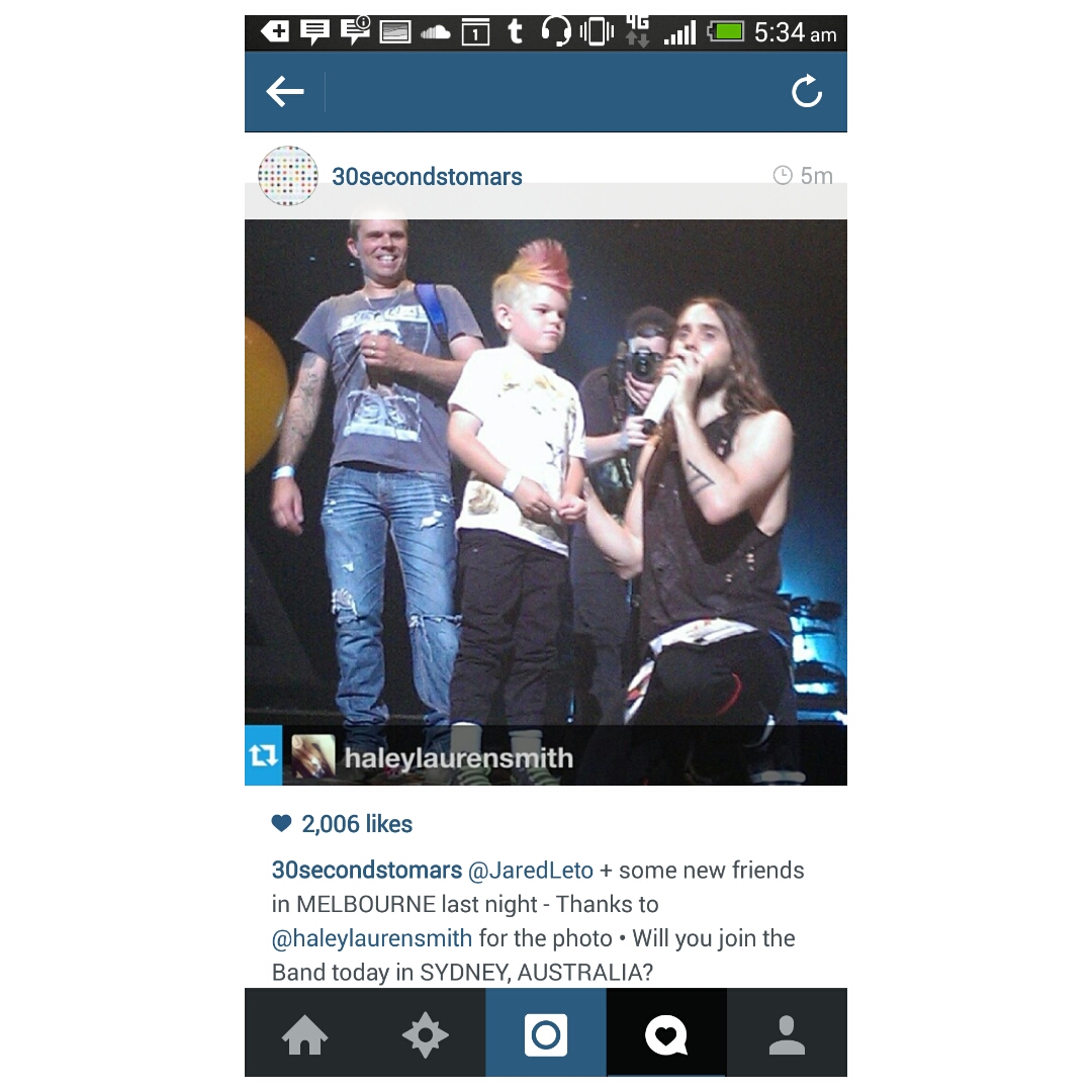 The next day at the airport, I was catching a flight at 6am for the Artifact screening and concert in Sydney and I was very excited. I had posted a photo on Instragram of Jared inviting a little boy on stage with a pink Mohawk and to my surprise the Mars Instagram had reposted my photo and tweeted it out to the world. My social media was a nightmare that day but I loved talking with people all over the world about the shows I was going to and reading about their experiences. So thank you for reposting my photo and giving me an opportunity to virtually meet other Echelon.